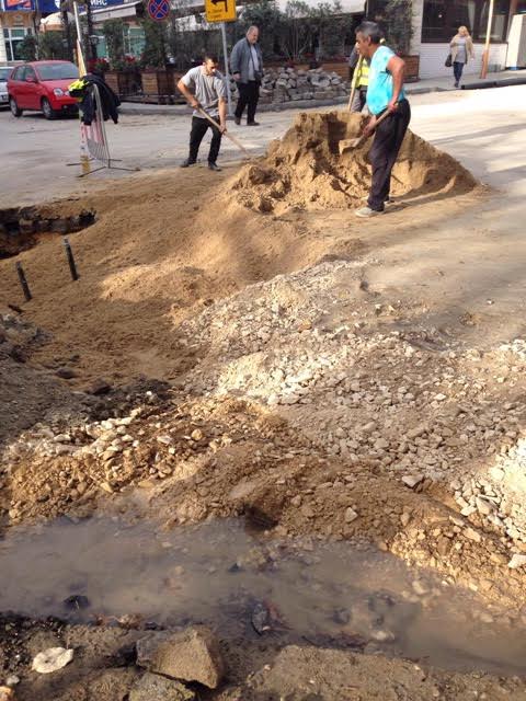 Както се вижда на снимките работници са изкопали здравите павета и дупките се запълват от пясък.