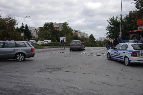 Двете предници на автомобилите са смачкани. Техни части са разпилени по цялото кръстовище. "Голф"-а е с отворени аербеци.