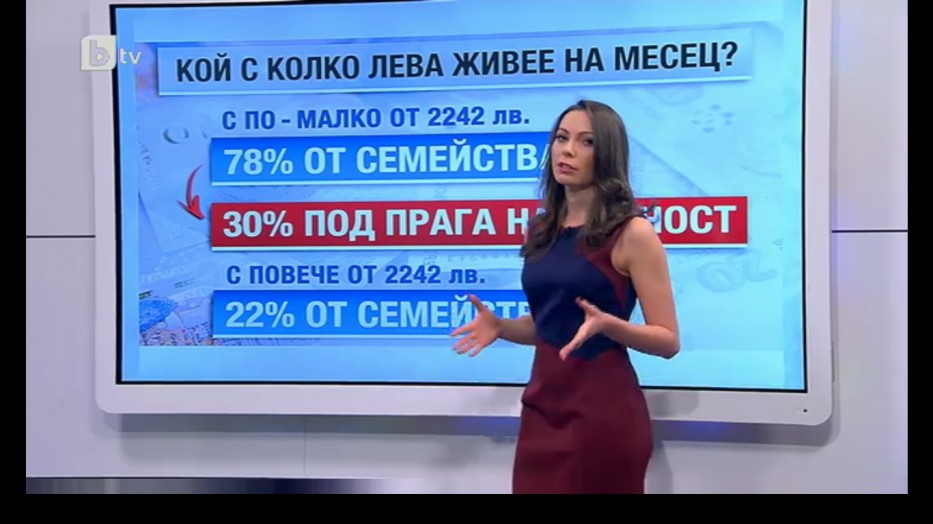 Статистиката показва, че 78% от семействата у нас живеят с по-малко от тези необходимите доходи, като 30% от тях живеят на прага на бедността, тоест на член от семейството се падат под 260 лв. на месец. С повече от необходимия доход живеят едва 22% от семейставата у нас.