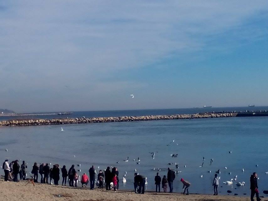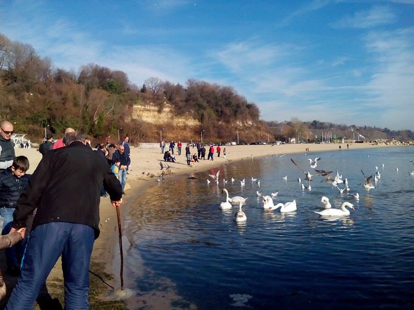И днес топлото време накара варненци да излязат на плажа. Там за пореден ден малки и големи се радваха на десетките лебеди и всякакви други морски птици.