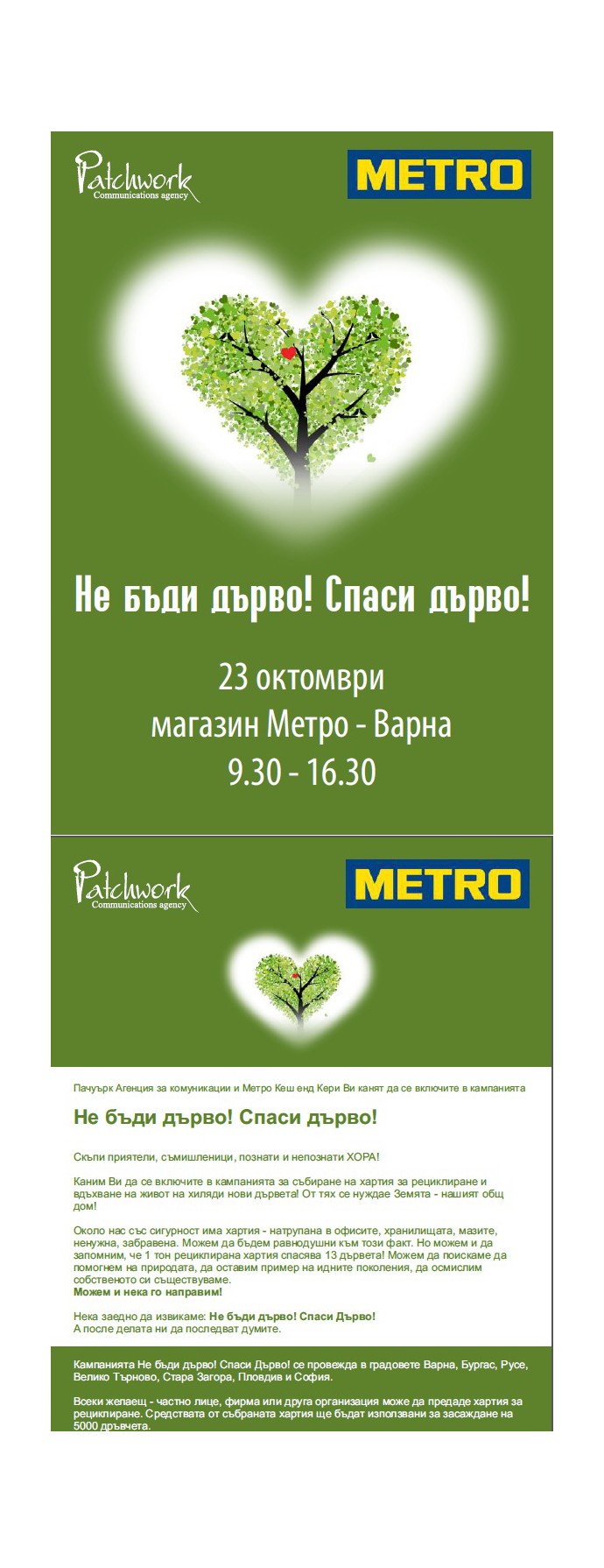 НЕ БЪДИ ДЪРВО! СПАСИ ДЪРВО! се организира от Пачуърк Агенция за комуникации и МЕТРО Кеш енд Кери