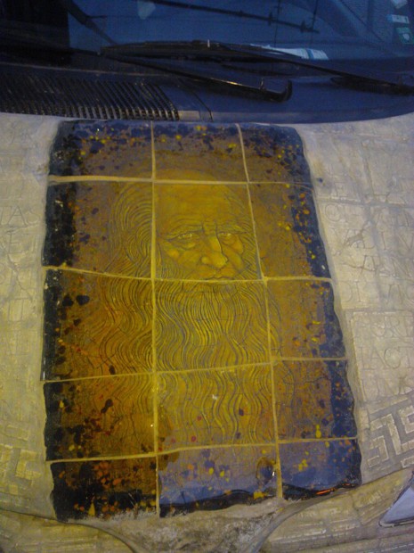 Изобразени са гръцки мотиви и сцени от битка. На предния капак има подобна на икона картина с лика на Леонардо да Винчи.