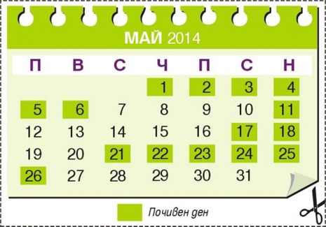 Май ще е песен за учениците. Въпреки че нямат официална ваканция, те ще почиват цели 15 дни (виж календарчето). Учебните дни са с един повече - 16, но пък между тях има интервали с глътка въздух.