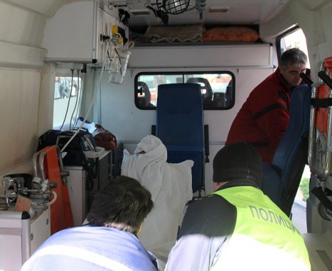 Транспортират ранените полицаи при престрелката в Лясковец от великотърновската болница МОБАЛ "Д-р Стефан Черкезов" към София.