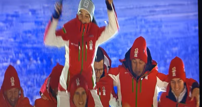 Тервел Замфиров качи на раменете си своята сестра Малена на парада на нациите на откриването на зимните игри