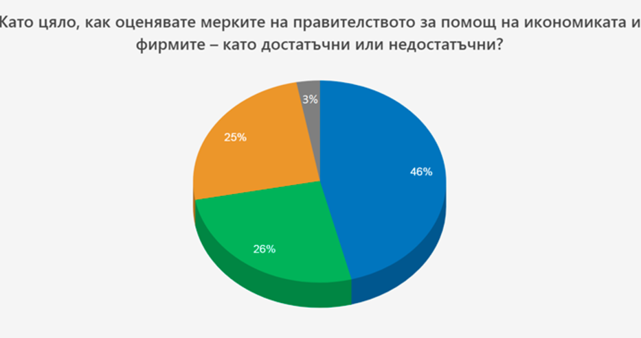 В същото време близо половината от анкетираните (46%) смятат, че мерките на правителството за помощ на икономиката и фирмите са недостатъчни.