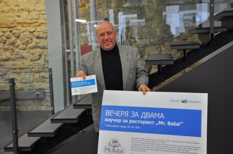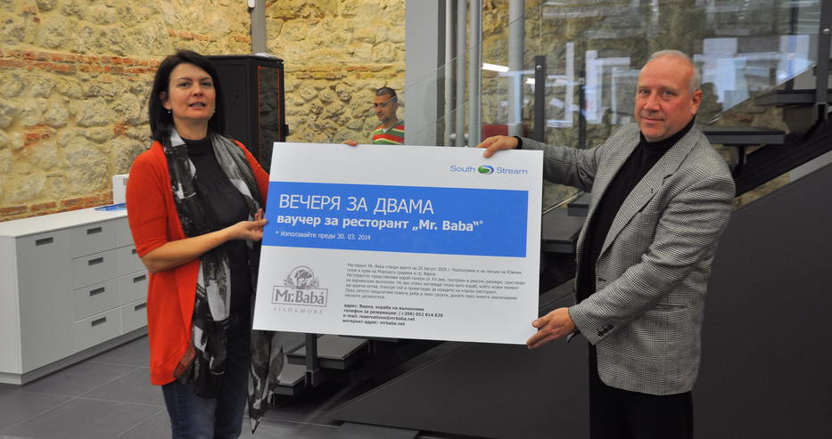 Информационния център на газопровода „Южен поток“ зарадва с приятна награда победителя в забавна игра, организирана за посетителите му. В нея заинтересованите от големия енергиен проект трябваше да познаят колко тежи парче от тръба, която ще бъде използвана за изграждане на газовото трасе. То е изложено в офиса, за да може всеки да получи реална представа с какви материали ще се изгражда „Южен поток“.