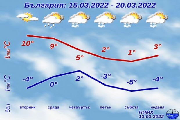 Във вторник ще преобладава слънчево време. Минималните температури ще са между минус 7° и минус 2°, а максималните - между 8° и 13°. От северозапад ще започне увеличение на облачността, отначало висока, което през нощта срещу сряда ще обхване цялата страна. В сряда ще е облачно, на много места от запад на изток ще превали дъжд.