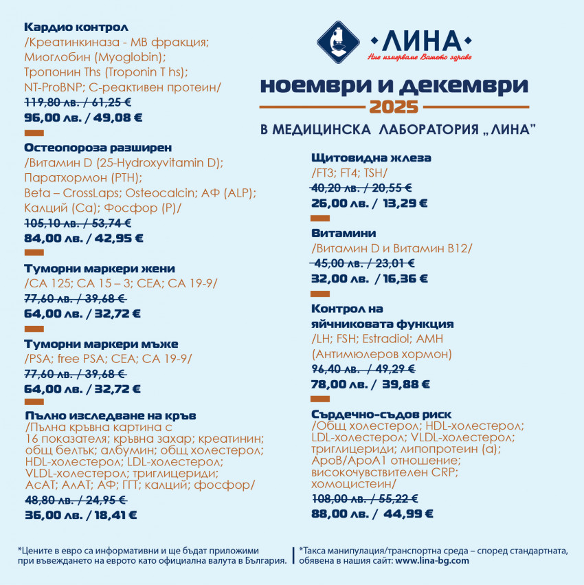 Грижата за здравето започва с навременната профилактика. Затова през ноември и декември 2025 г. медицинска лаборатория „ЛИНА“ прави важни анализи по-достъпни за пациентите. Сред тях са пълно изследване на кръв, хормони за щитовидна жлеза, пакети за репродуктивно и сърдечно-съдово здраве, туморни маркери, витамини и др.