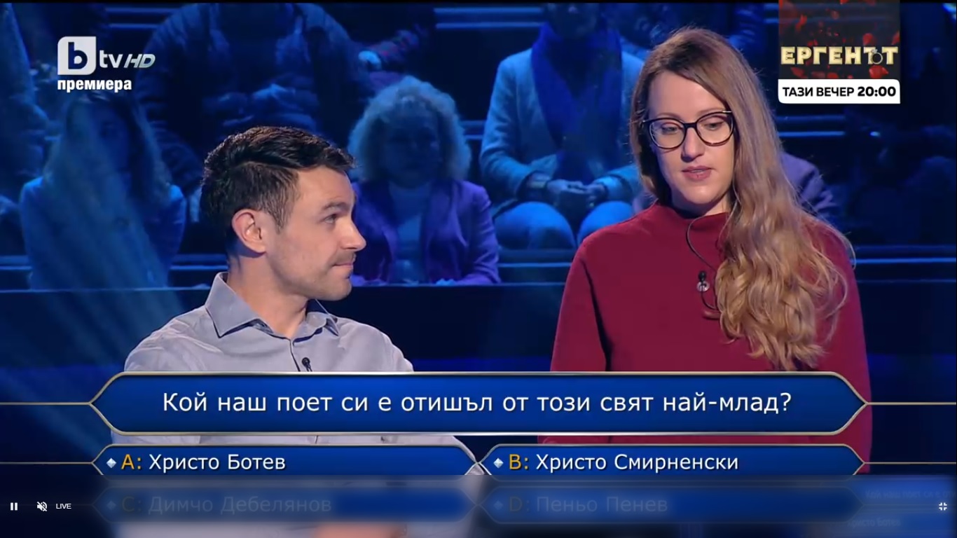 След това мъжът от Златоград повика и приятелката си от публиката Мария, с чиято помощ правилно избра Христо Смирненски.