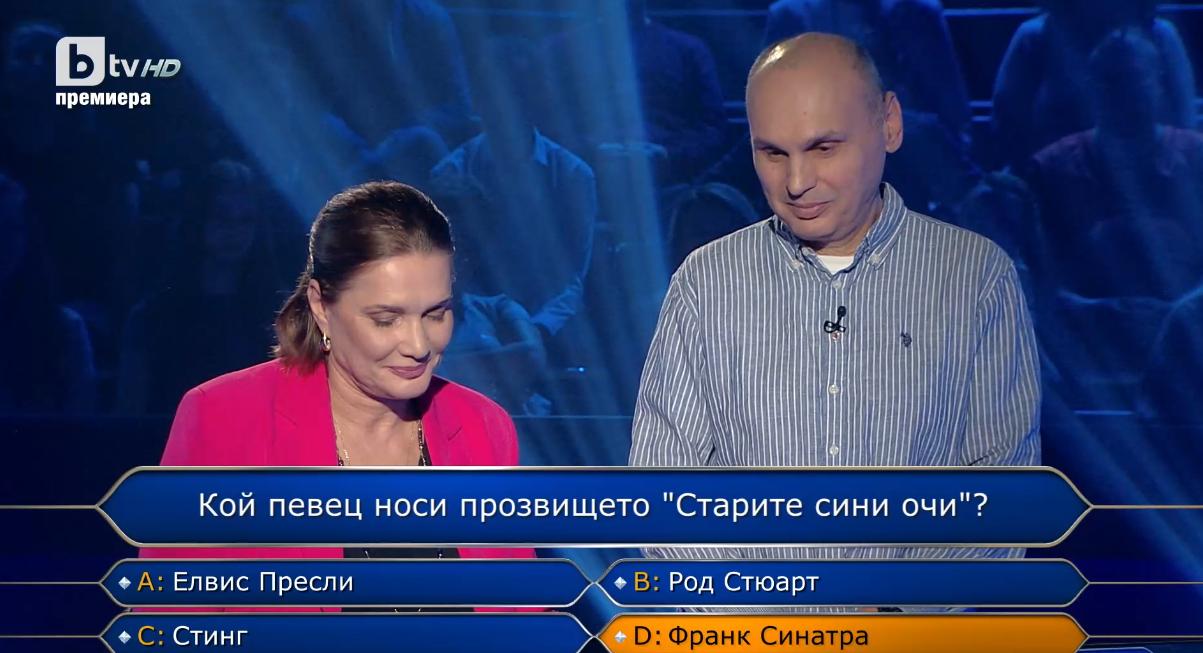 За 3000 лева тя бе попитана: Кой певец носи прозвището „Старите сини очи?, с опции Елвис Пресли, Род Стюарт, Стинг и Франк Синатра.