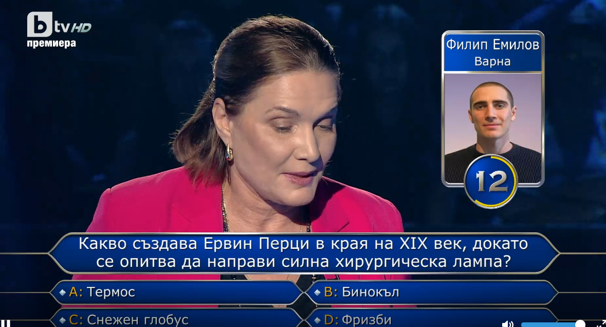 Всичко за нея обаче приключи при въпроса за 5000, като преди това участничката реши да заключи тази сума: Какво създава Ервин Перци в края на XIX век, докато се опитва да направи силна хируригическа лампа?, Термос, Бинокъл, Снежен глобус и Фризби.