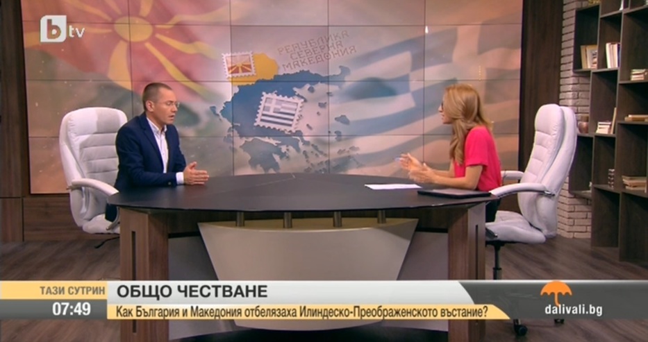 Това каза в сутрешния блок на bTV евродепутатът от ВМРО Ангел Джамбазки, който коментира вчерашното общо честване на годишнината от Илинденско-Преображенското въстание от страна на премиерите Борисов и Заев. "Македонизмът е измислица на Сърбия. Той, като антибългарска теза, е мъртъв. Искам да поздравя Бойко Борисов и Зоран Заев за това. За нас е важно да бъдат демонтирани до край антибългарските настроения в Република Македония, които бяха насадени след 1945 година. Македония е една и тя е българска", категоричен беше той.