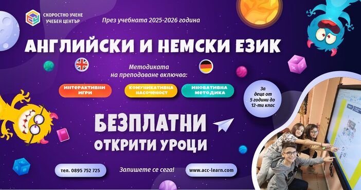 Учебен център „Скоростно Учене“ Ви кани на ОТКРИТ УРОК по Английски или Немски език за деца от 5 г. до 12 клас, където ще се запознаете с нашата методика и модерна учебна среда.
