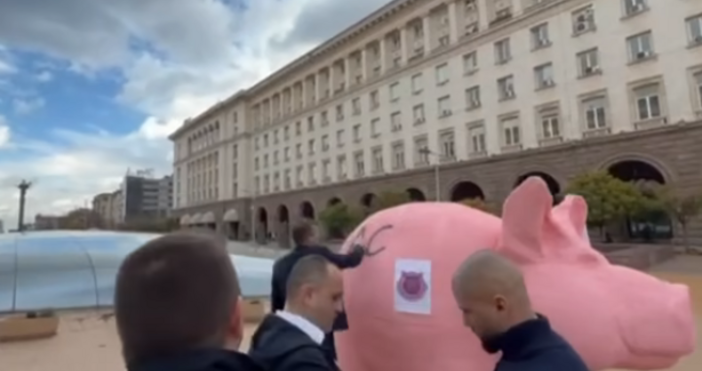 На него се вижда как Анастасов пише с черен спрей, а друг активист на партията покрива с плат физиономията на розовото прасе: