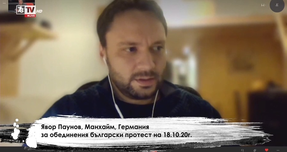 "Тук в Германия има граждански контрол върху властта. Нещо, което в България абсолютно липсва. Дистанцията между политици и население не е толкова голяма колкото в България. Особено имайки предвид, че тук не се влиза в политическата класа с цел лично обогатяване", разказа за предаването "Студио Хъ" по 7/8 тв българинът Явор Паунов от Манхайм, Германия във връзка с обединения български протест, предвиден за 18.10.20.