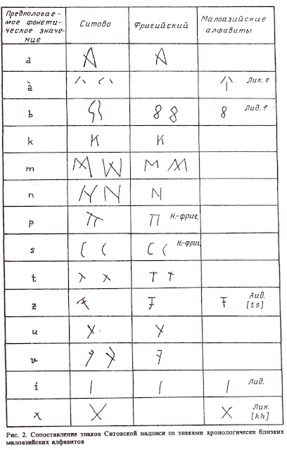 Лидия Байюн и Владимир Орел съпоставят буквите от Ситово с тези от фригийските надписи и намират забележителни успоредици. Въпреки, че споменават за близост с фригийските паметници от VIII-IVвек пр. Христа, руските учени смятат, че посланието от Ситово е направено в периода III-I век пр. Христа.