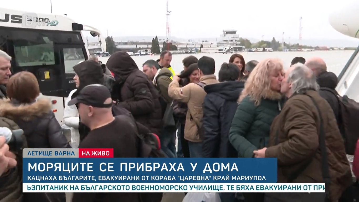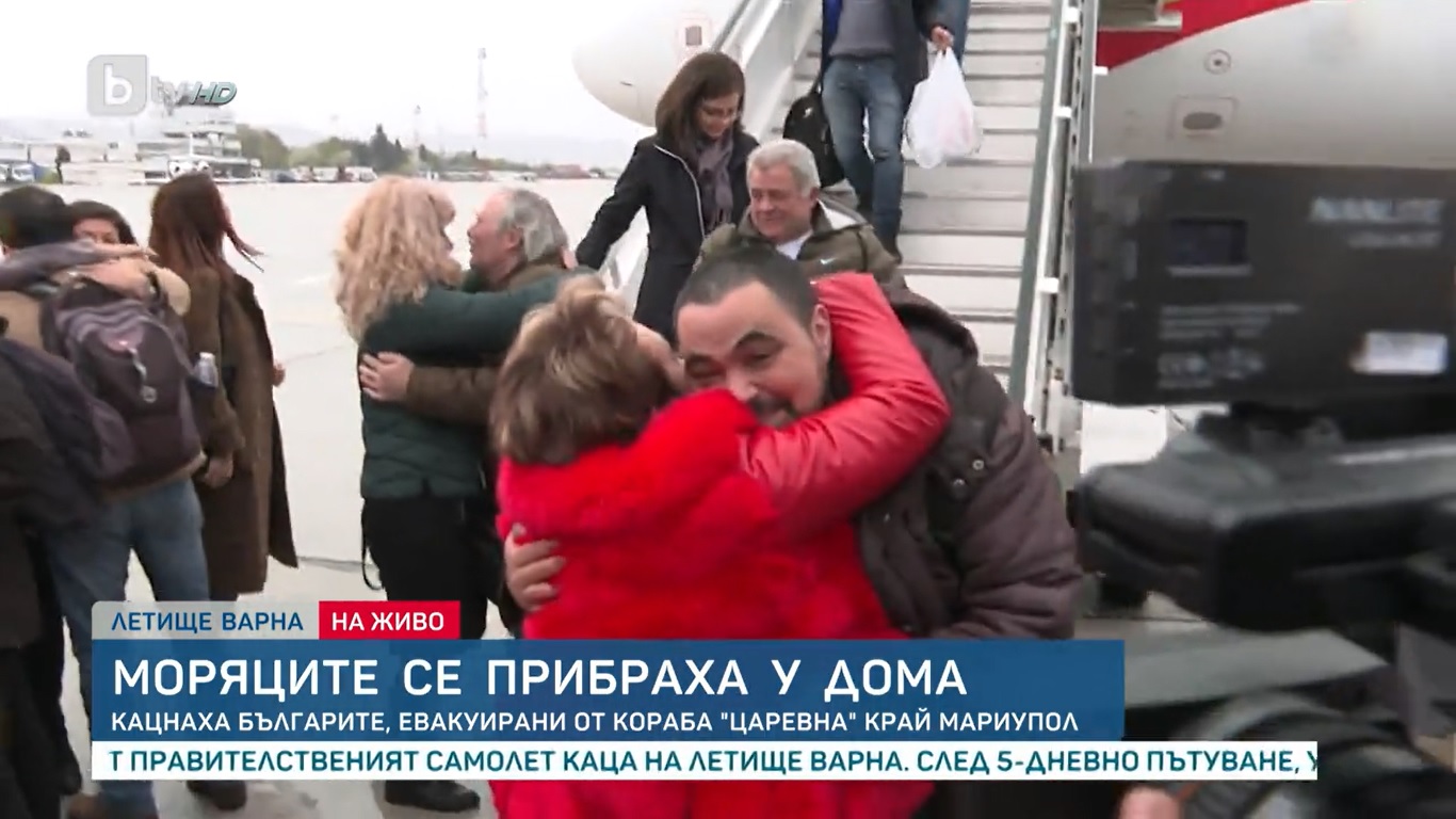 14-те български моряци от кораба "Царевна" вече са в прегръдките на близките си във Варна. Те слязоха току-що на летището от правителствения самолет, който ги прибра в родината им.