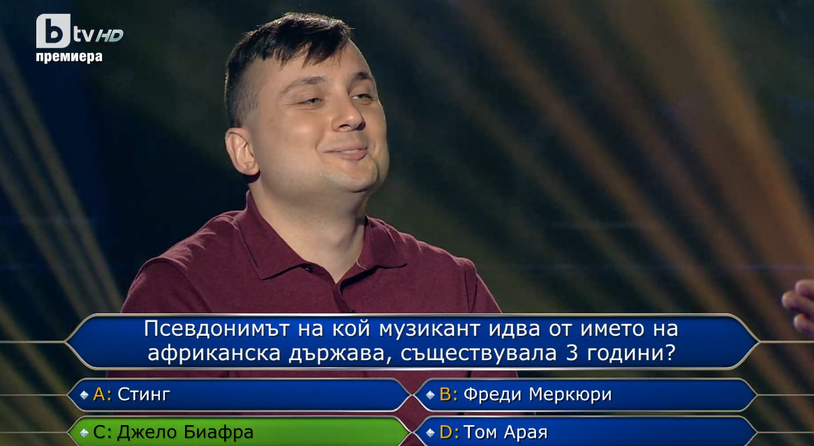Последва въпрос за 20 000 лева: Псевдонимът на кой музикант идва от името на африканска държава, съществувала 3 години? – Стинг, Фреди Меркюри, Джело Биафра и Том Арая.