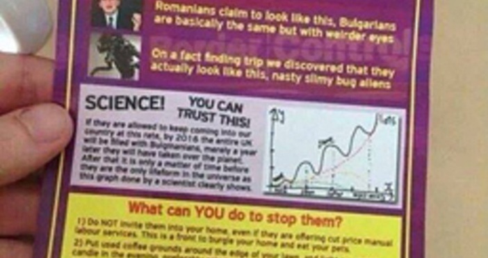 Листовката показва снимка на мъж с надпис „Румънците претендират, че изглеждат така. Българите изглеждат също така, но с по-странни очи". Под нея има снимка на хлебарка с надпис „Отидохме да проверим на място и установихме, че те изглеждат така - отвратителни, слаби чуждоземни насекоми".
