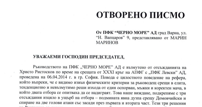 В Черно море смятат, че Христо Ристосков е предрешил крайния изход на мача с Левски с тенденциозни решения. По този повод от клуба изпратиха отворено писмо до шефа на съдиите и копие до Борислав Михайлов, с което изразяват своята позиция.