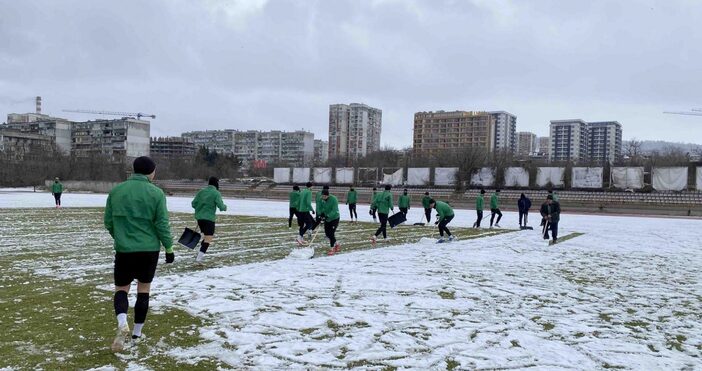 За загрявка играчите, треньорският щаб и помощният персонал почистиха терена от падналия през нощта сняг, а след това проведоха пълноценна тренировка.