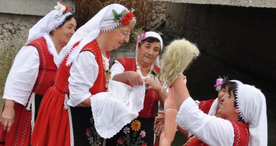 Кулминационен момент в обредността представлява обредното изкъпване на бабата-акушерка в реката или на чешмата. Мъжете и жените изнасят бабата навън и я качват в двуколка или на шейна. Понякога слагат бабата в голям плетен кош. Мъжете, преоблечени като "волове", с кожени маски и рога, влачат колата или шейната из селото. Ако по пътя невестите срещнат мъж, свалят калпака му и искат откуп. Шумната дружина отвежда бабата на реката и там мъжете обръщат двуколката или коша, в който носят старицата. Изкъпват я във водата. Този обред е известен по нашите земи като "влечугане" на бабите. Вечерта на селския мегдан всички се залавят на общо хоро, с което празничният ден завършва.