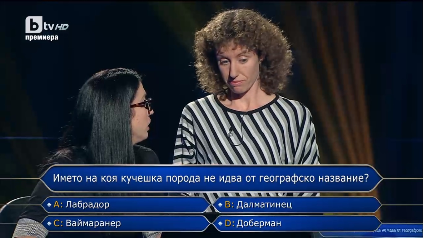 "Името на коя кучешка порода не идва от географско название?", я попита след това Ники Кънчев, а опциите, които й даде, бяха Лабрадор, Далматинец, Ваймарнер и Доберман. Тя изключи далматинец и ваймарнер, но не можа да реши сама и извика сестра си Пенка. С нейна помощ правилно избра доберман и така продължи напред.