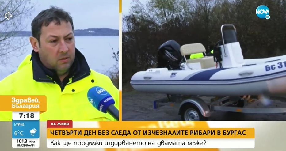 Четвърти ден без следа от рибарите, изчезнали в района на язовир „Мандра“ край Бургас. В сряда, освен с лодки и водолази, търсенето им се осъществяваше и по въздух с дрон, оборудван с термокамера, а доброволци и общински служители обикаляха пешеходните обходи по бреговете на язовира, предава Нова тв.