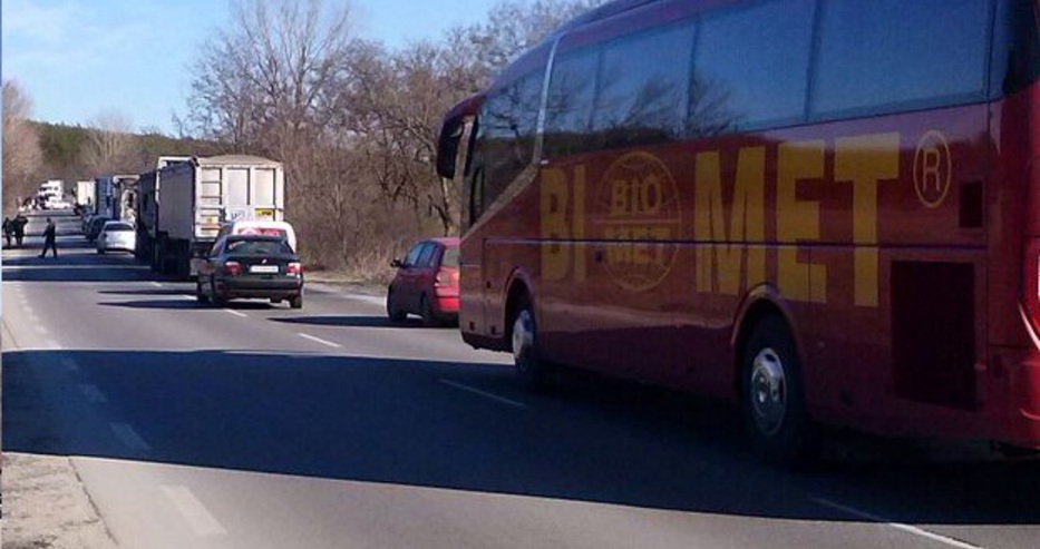 Движението е напълно блокирано. Има пострадали. Минала е линейка. Образувала се е огромна колона с автомобили.