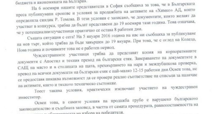 В сигнала са изложени твърдения за извършени незаконосъобразни действия от синдика на завод „Химко“ АД - Враца във връзка с процеса по продажбата на активите на завода, както и получен подкуп от синдика. Това се казва в официално изявление на прокуратурата, пише блиц.