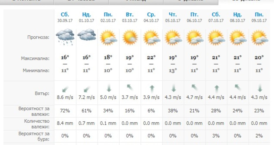 През следващите три дни ще има повече слънце. В неделя значителна ще остане облачността над югоизточните райони и там на отделни места ще превали слаб дъжд; в Източна България ще продължи да духа до умерен североизточен вятър. Сутрин ще е студено, с минимални температури в по-голямата част от страната между 4° и 9°, край морския бряг до 12-13°; на отделни места в котловините в Западна България ще се образува слана. Дневните температури ще се повишат още и във вторник максималните ще са между 20° и 25°.