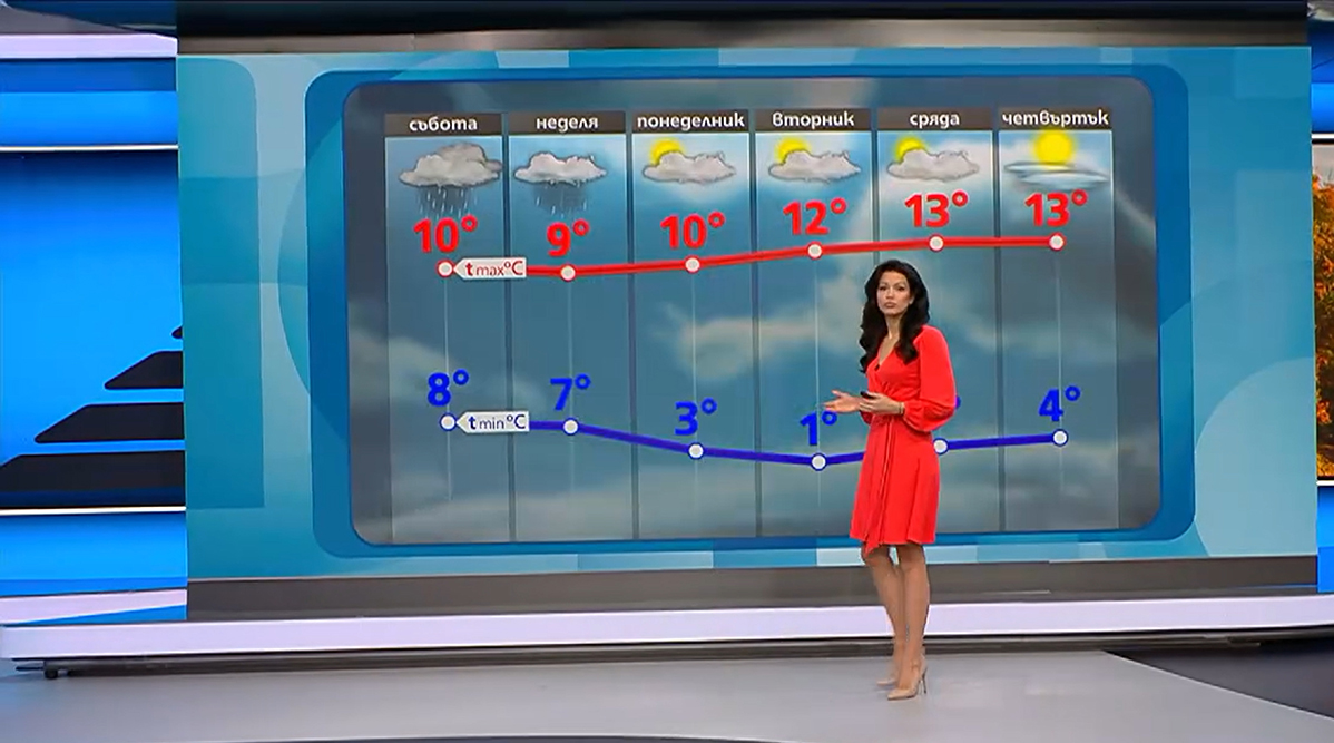 В началото на следващата седмица облаците ще започнат да се разкъсват и намаляват. Сутрин ще бъде доста хладно, със стойности около нула градуса, но дневните температури и бавно ще се повишават, обясни синоптичката на Нова телевизия.