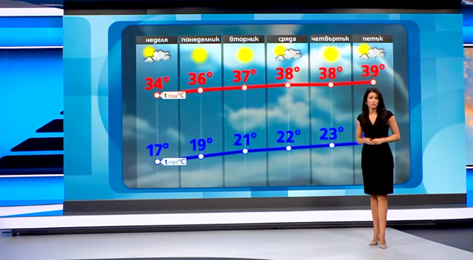 През следващата седмица ни очаква поредната за това лято доста сериозна гореща вълна. С всеки изминал ден показанията на термометрите ще се повишават и от вторник до петък максималните в някои райони ще достигат около и над 40 градуса. Жегите ще бъдат съпроводени и с много слънчеви часове. Повишава се опасността от здравословни проблеми, както и риска от възникване на пожари. Бъдете изключително внимателни, предупреди Деница Стоянова.