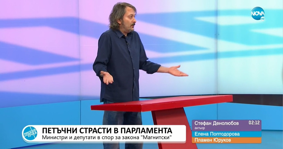 Актьорът Стефан Денолюбов коментира днешната ситуация в парламента и "престрелките" между лидера на ДПС Мустафа Карадайъ и финансовия министър Асен Василев заради Делян Пеевски.
