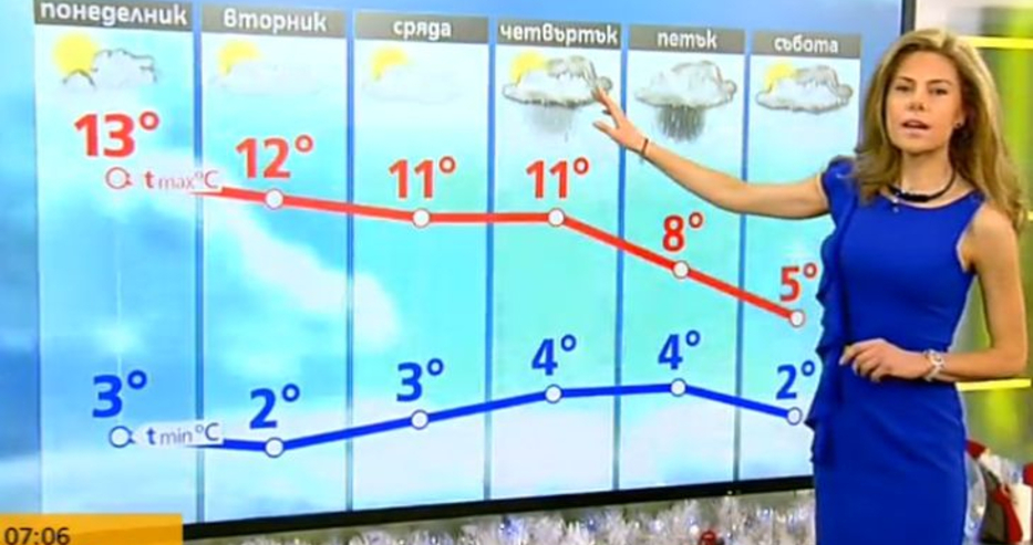 Над планините ще бъде предимно слънчево. Ще духа умерен, по билата и временно силен северозападен вятър. Максимална температура на височина 1200 метра около 9°, на 2000 метра – около 3°. Над Черноморието ще бъде предимно слънчево. Ще духа слаб до умерен западен вятър. Максимални температури на въздуха: 12°-13°. Температурата на морската вода е 7°-9°. Вълнението на морето ще бъде 1-2 бала. Синоптичката показа и трапезата, на която е седяла на Бъдни вечер. Банова призна, че е била при майка си, а ястията на масата са били точни 11. Тя обаче не сподели дали е била придружена от Плевнелиев или той е отсъствал от вечерята. "Започнахме с молитвата. За мен трапезата точно на този празник е най-хубавата, защото идва точно Рождество Христово", каза Банова.