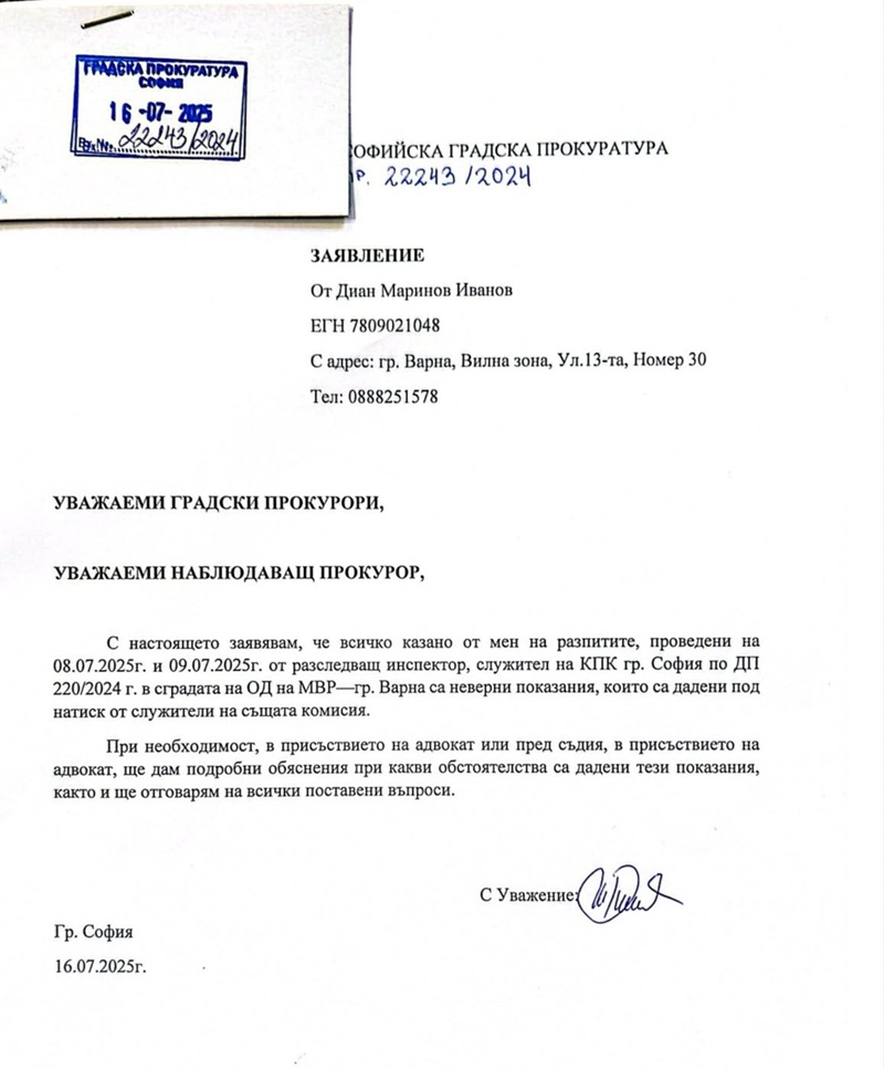 „Днес подадох Заявление пред Софийска градска прокуратура, с което заявявам, че показанията ми по ДП 220/24 са неверни, тъй като същите са дадени под натиск от служители на КПК - гр. София. Предстои да видим какво ще се случи с мен… „, пише Иванов.