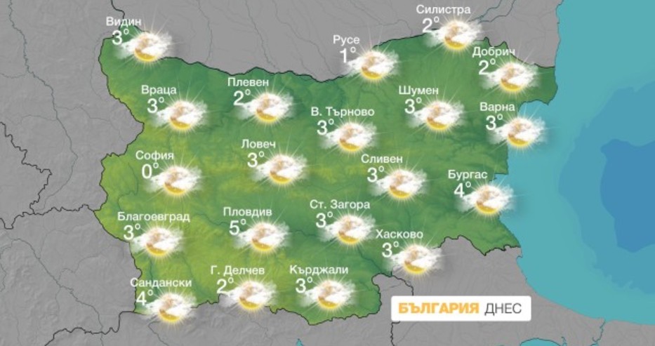 През нощта над по-голямата част от страната ще има временно разкъсване и намаление на облачността. Още преди обяд от запад отново ще се заоблачи и на отделни места в Западна България ще превали слаб сняг, в северозападните райони за кратко снегът ще е примесен с дъжд и ще има условия за поледици. Ще духа слаб до умерен вятър от юг-югозапад. Температурите слабо ще се повишат и минималните ще са от минус 8° до минус 3°, а максималните – между 2° и 7°.