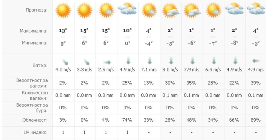 Преди обяд все още ще духа слаб северозападен вятър. Максимални температури на въздуха, и на морската вода 9-11°. Вълнението на морето ще бъде около 2 бала. Над планините ще бъде слънчево. Ще духа до умерен вятър от север-североизток. Максимална температура на височина 1200 метра около 6°, на 2000 метра - около 2°.