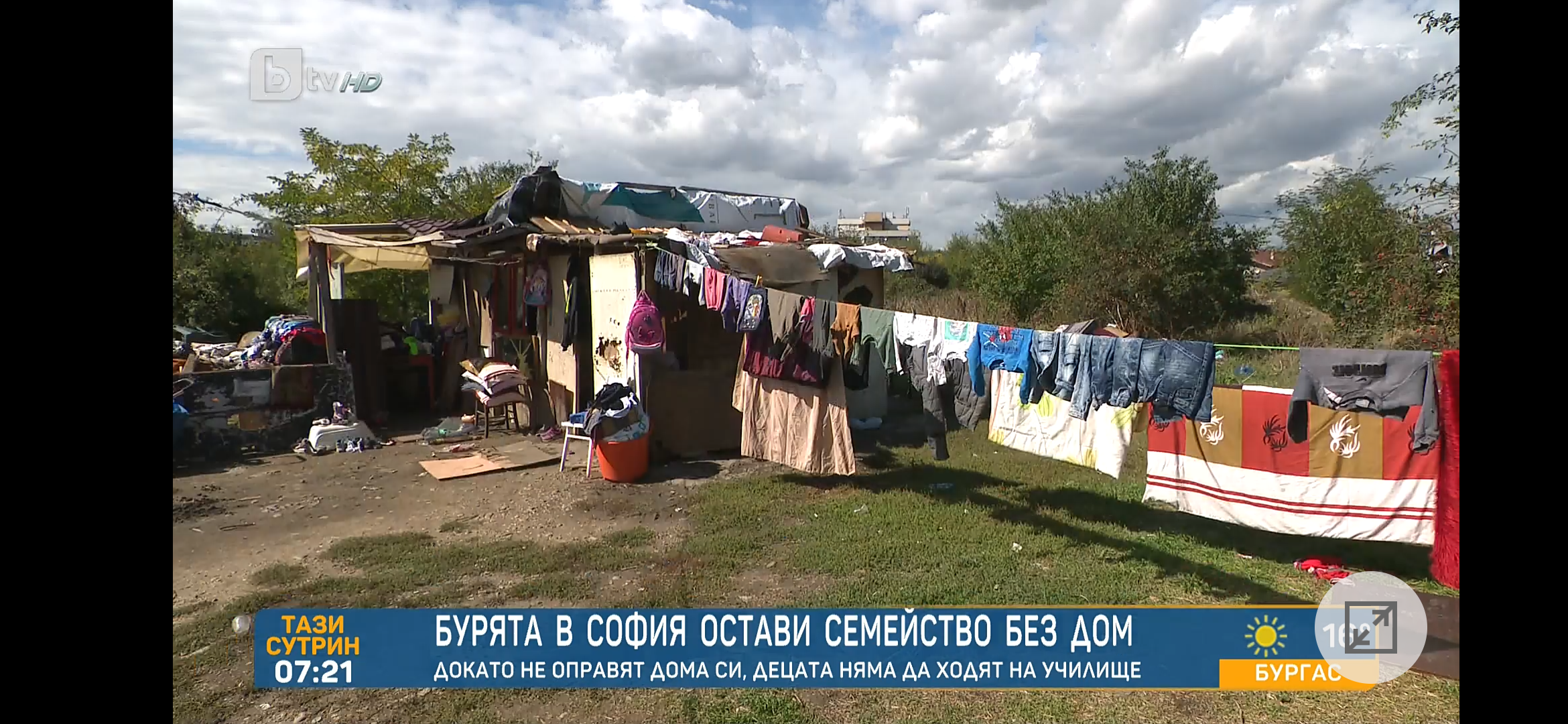 Домът на майка с 8 деца остана без покрив след бурята във вторник, показа БТВ. Семейството живее в изключителна нищета. А тревогата на 41-годишната Жана е, че децата няма да могат да посещават училище, докато не възстановят дома си. Преди 15 години 41-годишната Жана Коцева сама построява дома си. В момента тя живее с 8 от общо 11-те си деца. До вторник, когато силна буря се изви над София.