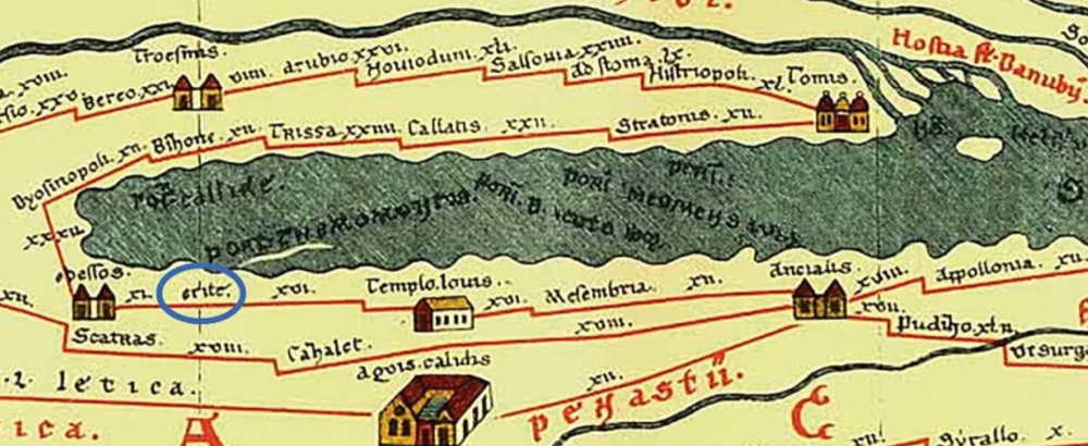 За първи път името на укреплението (oppidum) до устието на р. Камчия под формата Ерета (Ereta) се споменава в „Естествена История“ на Плиний Стари, завършена около 77 г. сл. Хр. Следващото по време сведение за крепостта е в сегмент VII на Пойтингеровата карта, чийто оригинал се датира в III или IV в. сл. Хр. Най-късното споменаване на топонима е в т. нар. Анонимна Равенска космография, създадена през VII в. сл. Хр. въз основа на по-ранни източници. В нея Ерета/Ерите (Erite) се споменава два пъти при описания на западнопонтийските градове, най-вероятно взети от карти, подобни на Пойтингеровата, или от пътеводители.