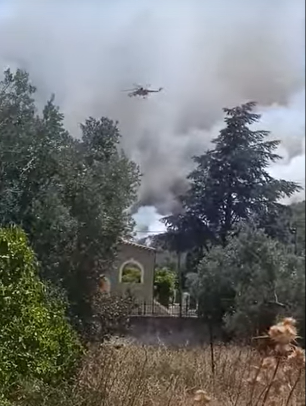 Първият пожар е избухнал в област Маратонас край манастира "Св. Рафаил". В гасенето му участват пет противопожарни самолета, два хеликоптера, 90 огнеборци, три наземни екипа, 20 противопожарни коли, общински цистерни с вода и доброволци, предава Дарик.