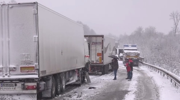 Пътят Русе - Велико Търново бе затворен тази сутрин за камиони заради силен снеговалеж. В други части на страната пътищата също бяха затворени заради закъсали тирове. В Монтана, където в момента е най-дебела снежна покривка, стана верижна катастрофа между тирове, разказва Нова тв.