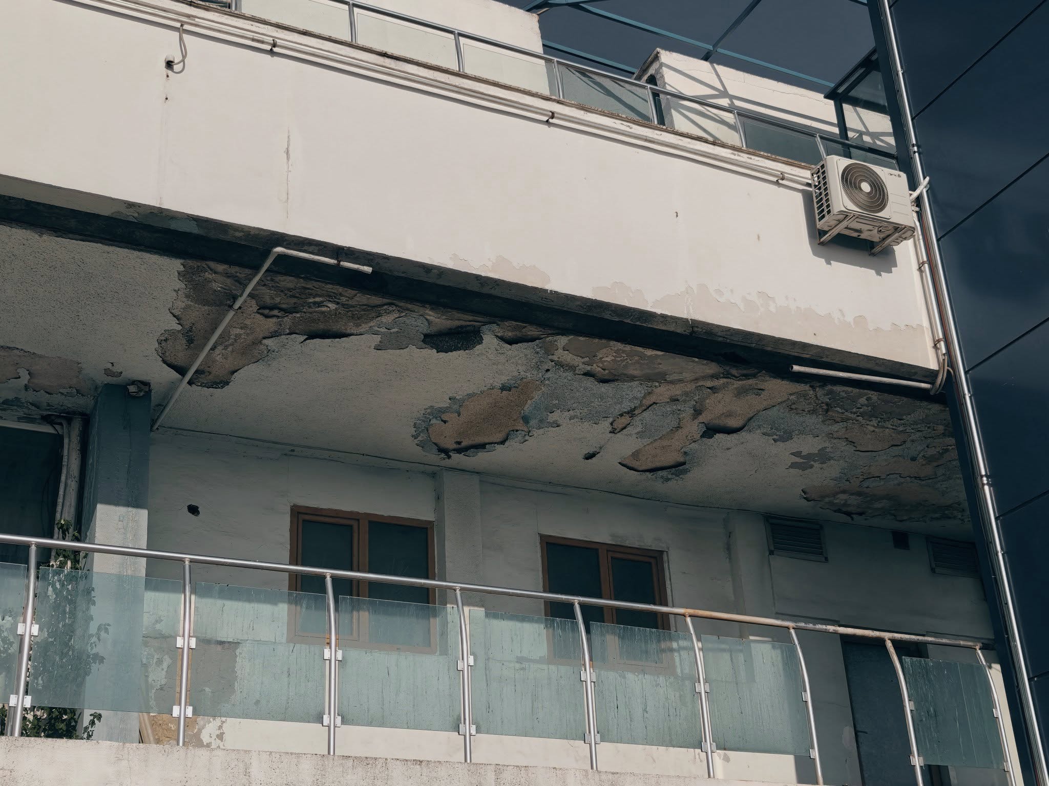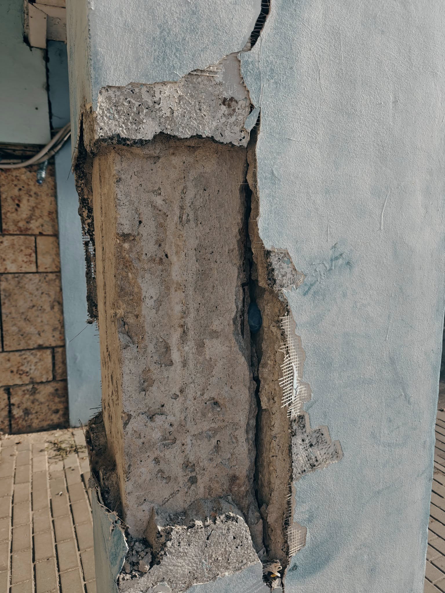 Освен пукнатините, се вижда и нападала мазилка близо до асансьора в предната част на сданието.