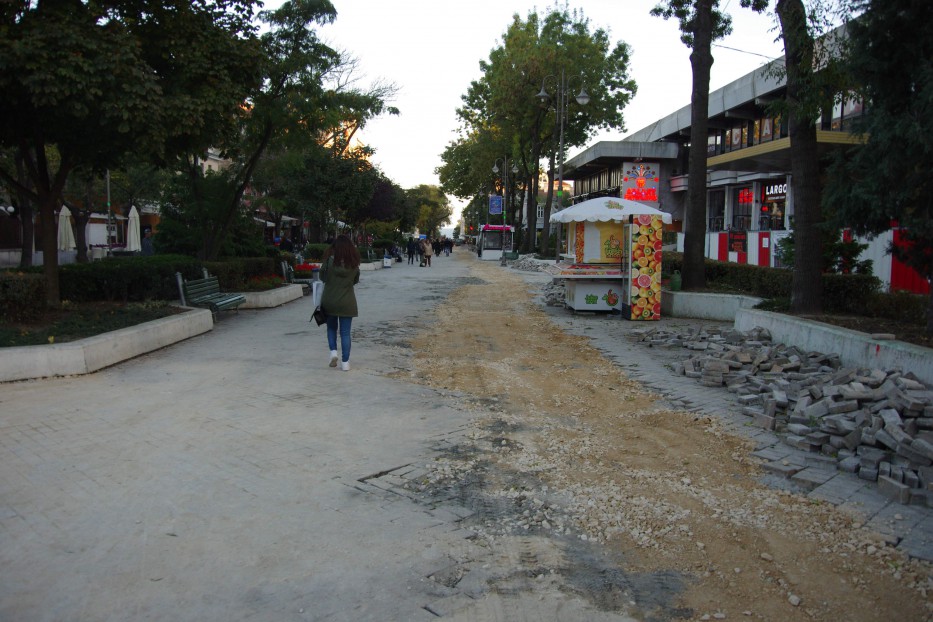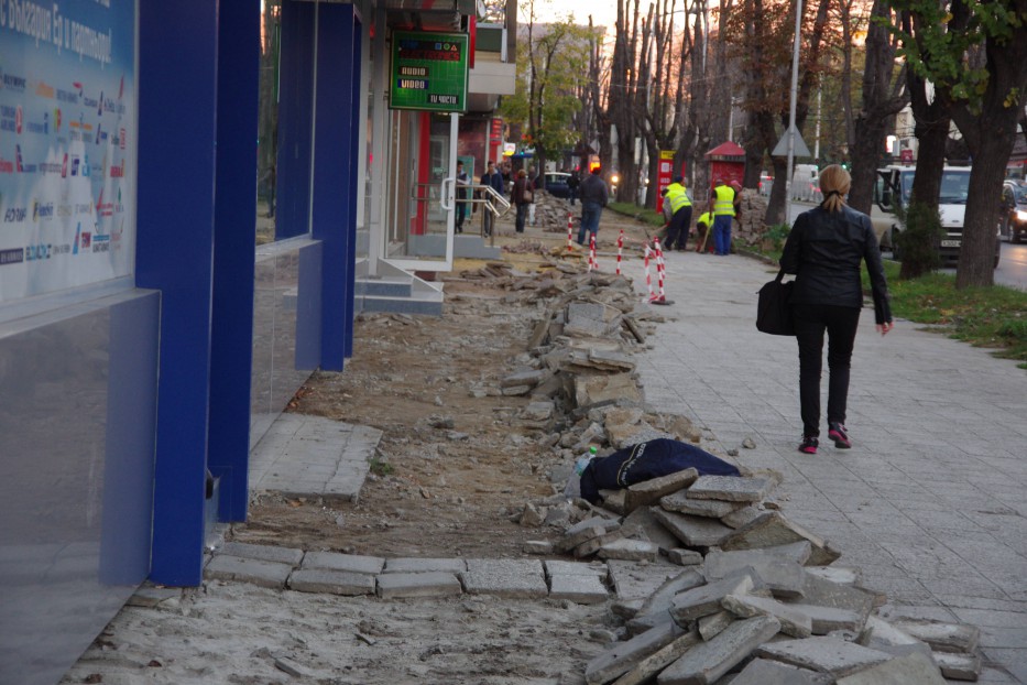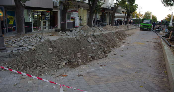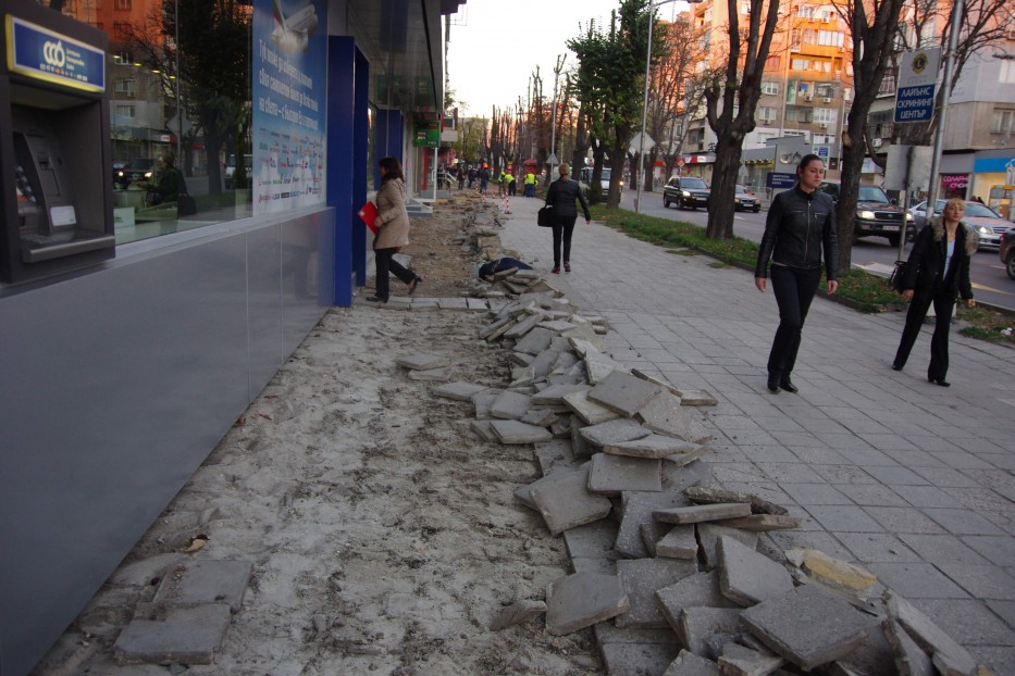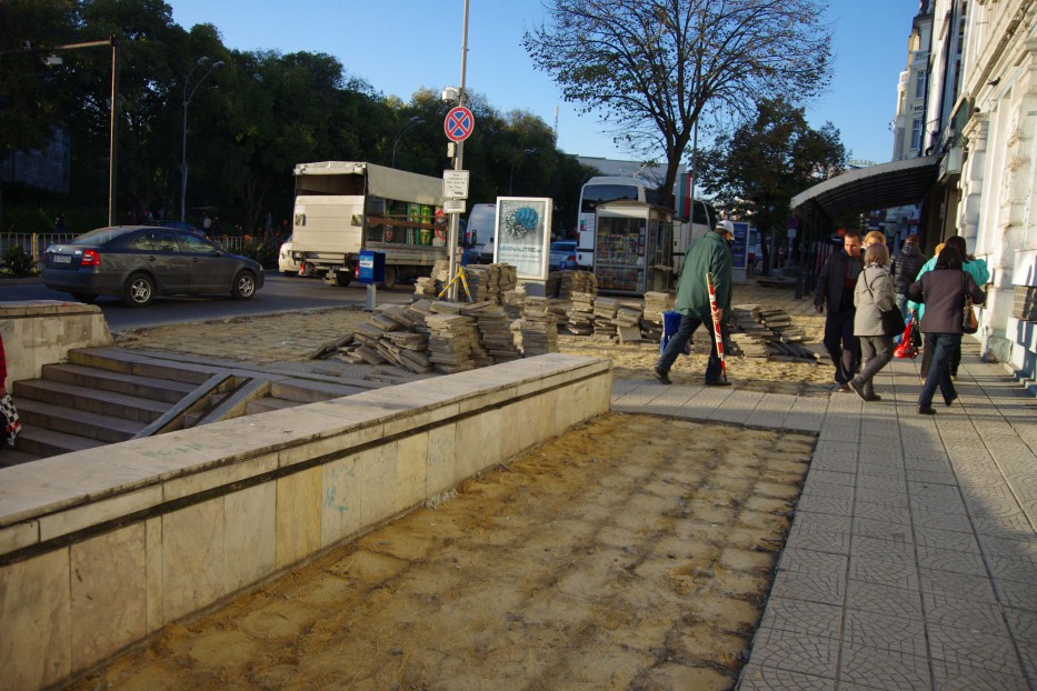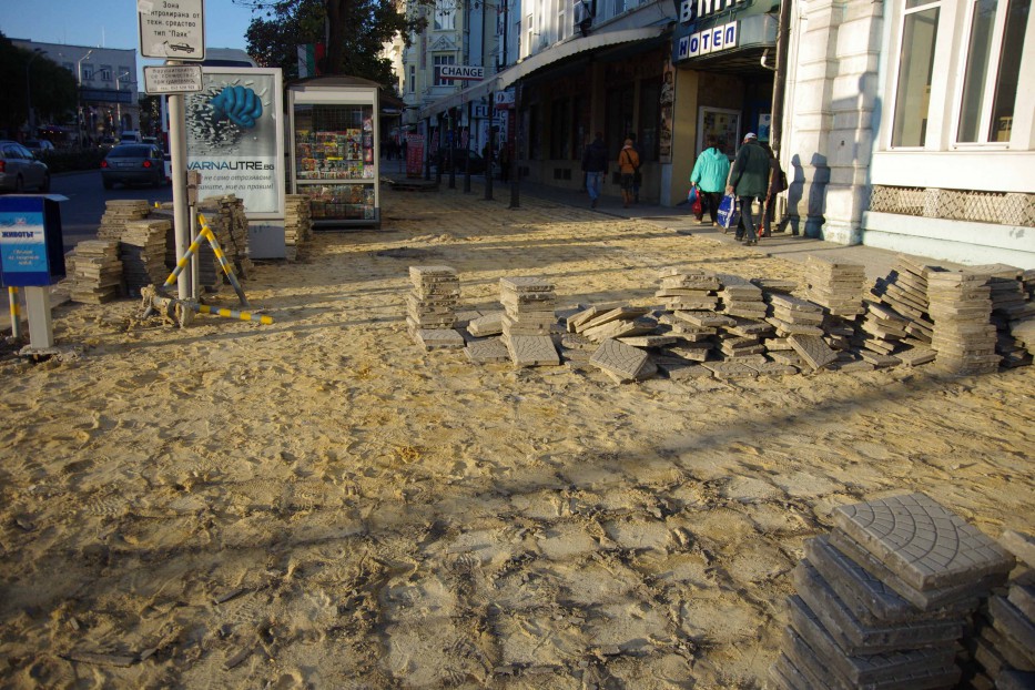 Част от тротоарите в центъра на Варна са с изровени плочки от днес. Без настилка остана голяма част от пешеходната зона на бул. „Осми Приморски полк“.
