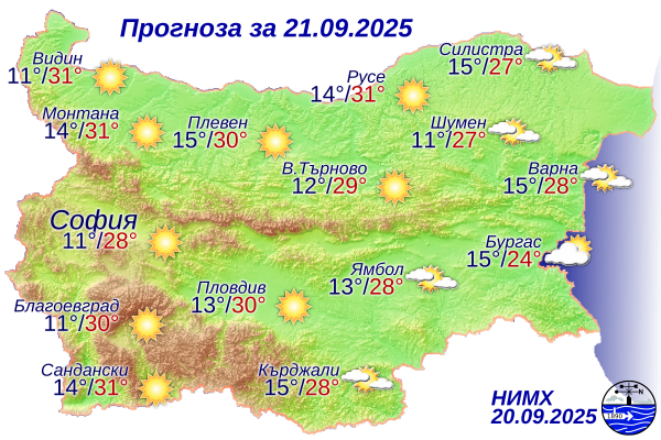 През нощта ще бъде ясно и почти тихо. Преобладаващите минимални температури ще бъдат между 10° и 15°, в София - около 11°. Утре ще бъде слънчево, но преди обяд над Източна България ще има ниска облачност. Ще духа слаб до умерен източен вятър. Максималните температури ще бъдат между 26° и 31°, в София - около 28°.