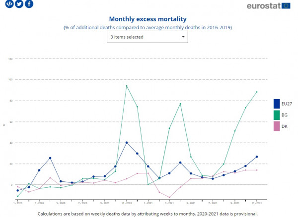 Излишната смъртност в ЕС спада до +23% през декември 2021 г. (в сравнение със средните стойности за същия месец през 2016 – 2019 г.) от +26% през ноември 2021 г. Ситуацията продължи да варира в различните държави-членки през декември 2021 г. с налични данни: от +4% в Швеция и +5% във Финландия и Италия, до +60% в 🇸🇰Словакия и +69% в Полша.