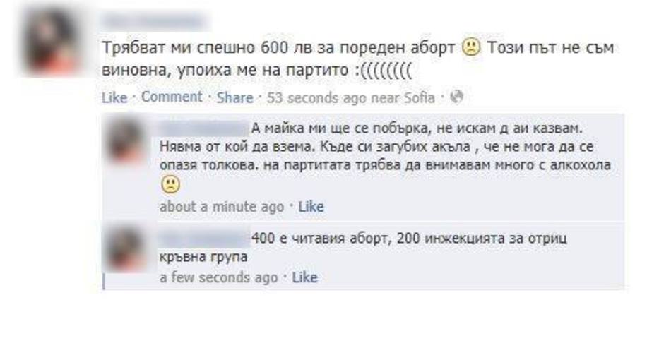 От два дни "Фейсбук" гърми, че служителка на bTV е била упоена и забременена на купон. Като доказателство се прилага пост на потърпевшото момиче. "Трябват ми 600 лева за пореден аборт. Този път не съм виновна, упоиха ме на партито", пише дамата, която в онлайн визитката си е посочила, че работи в bTV Action.