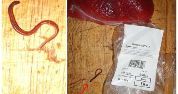 "Не знам дали за добра или за зла участ се случи точно на мен. В сряда, 11 декември, купихме от “Кауфланд” в Бургас около 300 гр. телешки шол, който обикновено после разделяме на порцийки и го замразяваме за децата. Вкъщи го прибрах в хладилника така, както си беше в пликчето, и на следващия ден вечерта съпругът ми го извади, за да отреже две резенчета за вечерята на малките и да замразим останалото. И от пликчето, заедно с месото изпадна едно тънко, червено, кръгло и съвсем живо червейче, дълго около 3 см! Дори на снимките е в различна поза, защото с въртеливи движения и явно постоплено, бързо се придвижаше към месото, докато се опитвах да го снимам.