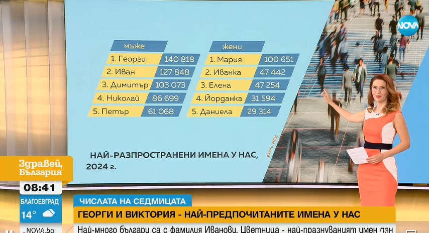 Сто и четиридесет хиляди осемстотин и осемнайсет. Точно толкова български мъже носят името Георги, най-разпространеното име у нас и през миналата година по данни на Националната статистика. Следват го имената Иван и Димитър, като и двете ги носят над сто хиляди българи. След тях се нареждат Николай и Петър, които пък затварят групата на първите пет.